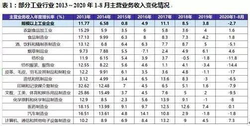 2020年1-8月,全部工业的主营业务收入年度增长率为-2.7%,表明了整体经济尚处于恢复期间。从月度走向来看,降幅逐月收窄,转正的希望很大。