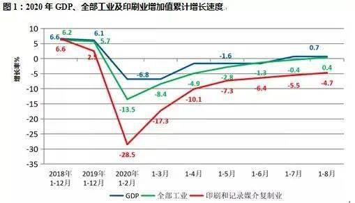 新冠疫情,对中国经济、对印刷产业都造成了严重的影响。为了方便对比,加入了2018年以及2019年的全年增速。新冠疫情初起时,全国经济按下了暂停键。在1-2月,无论是GDP、全部工业,还是印刷行业,都出现了巨大的降幅,这是多年未曾出现的景象。
