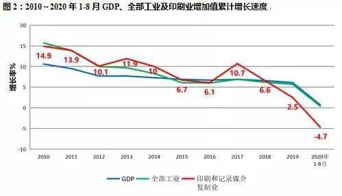 近10年来,经济发展速度都处于一个下降的通道中。全部工业的下降程度和波动幅度,比GDP的要大。而印刷业的下降程度和波动幅度,又比全部工业的平均水平要大。