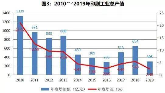 印刷行业在前5年中,基本还是处于两位数的增长;但是近5年,速度开始逐年走低。2020年又因为新冠疫情,会成为历史上低点。