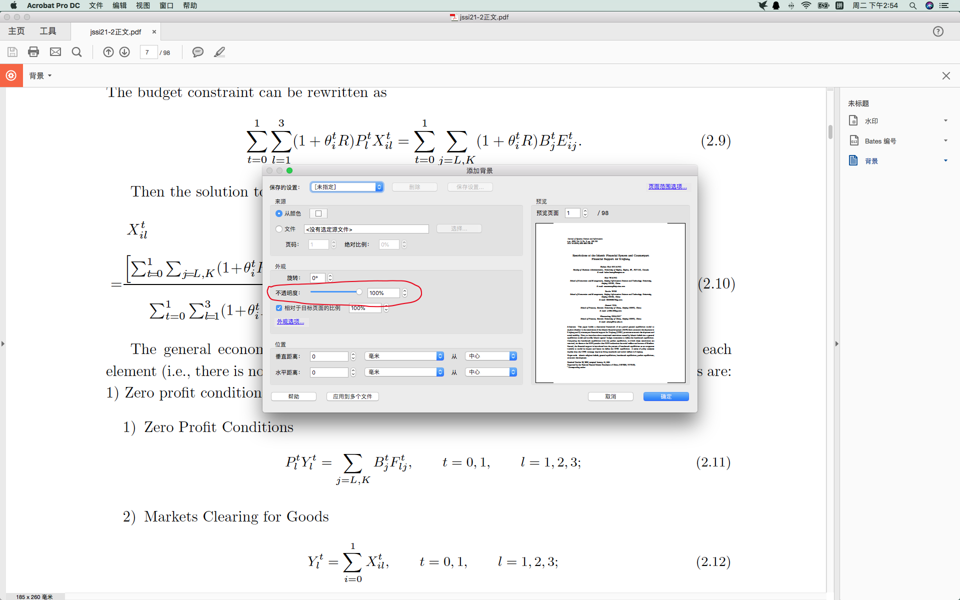 2、用Adobe Acrobat打开如下图选择背景——添加透明度100%——确定