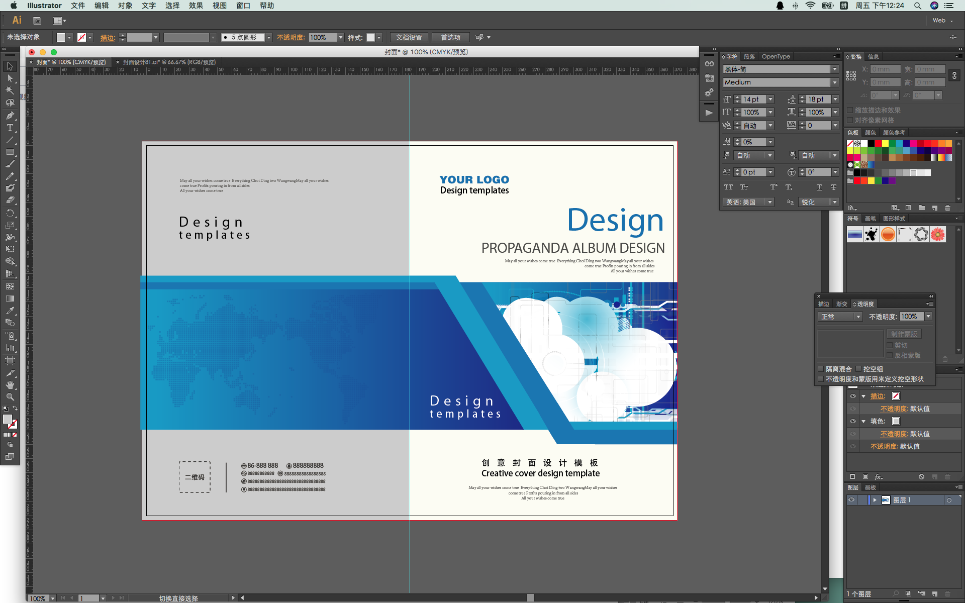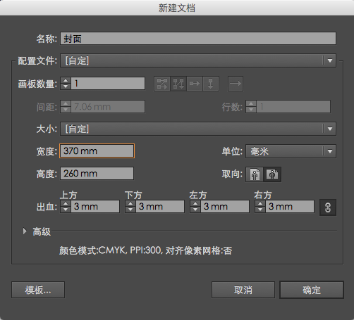 设计常用软件IIIustrtor(简称ai)和Photoshop(简称psd)。本次分享在ai中设计封面, 首先根据正文排版尺寸和页数,设定新建版面尺寸,这步很关键必须和正文统一,书刊最多的尺寸为B5=185x260mm和A4=210x297mm。如正文是B5的创建页面尺寸185x2=370x260mm,必须注意出血必须设置3mm,此封面适合无书脊骑马钉的书如图1。如果正文96页需按实际页数计算书的厚度(参考本公司的纸张厚度克重表计算),比如正文96页用80g胶版纸印刷计算公式为96➗2=48x0.08=3.84+封面用纸如250g无光铜0.26=4.1+侧胶0.5=4.6mm。 4.6mm是书刊最终的厚度,创建页面尺寸(185x2+4.6)=374.6x260mm,完成后储存pdf文件这样就可以印刷了。