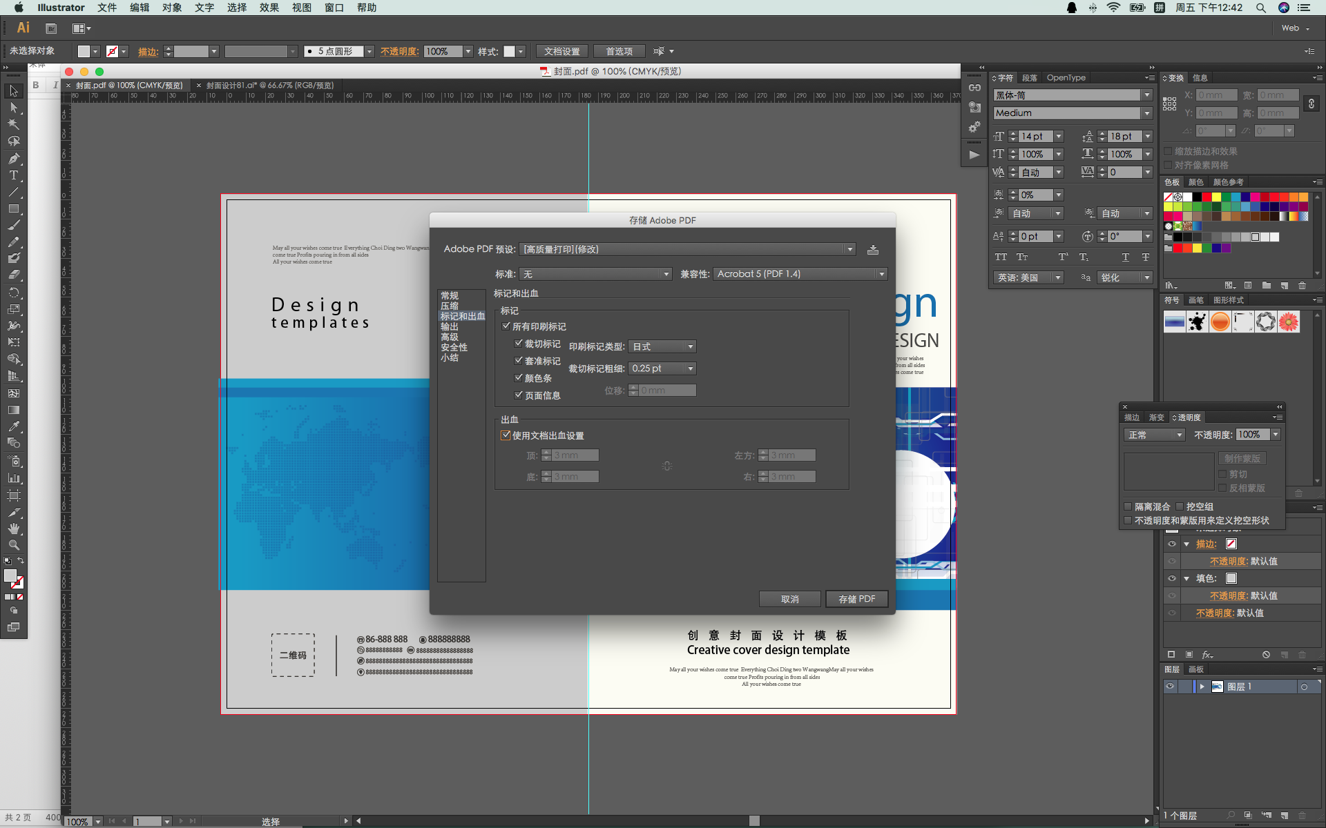 图4为保存pdf最终印刷文件,此文件保存时可选择保留Adobe IIIustrtor编辑功能,为以后修改方便,优点就是文件小占用内存少转发快,印出后文字清新为矢量文件。还可以设置专色、潘棕色、uv、起凸、压凹等几十上百个转色,是设计爱好者使用最多的软件之一。